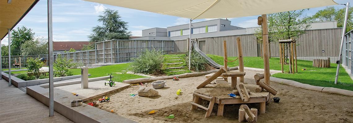 Das Außengelände mit seinen vielen verschiedenen Bereichen wie zum Beispiel Rutschbahn, Spielhäuschen, Hängematte, Drehbär und einem großen Sandbereich bietet den Kindern unterschiedlichste Spiel- und Entdeckungsmöglichkeiten.